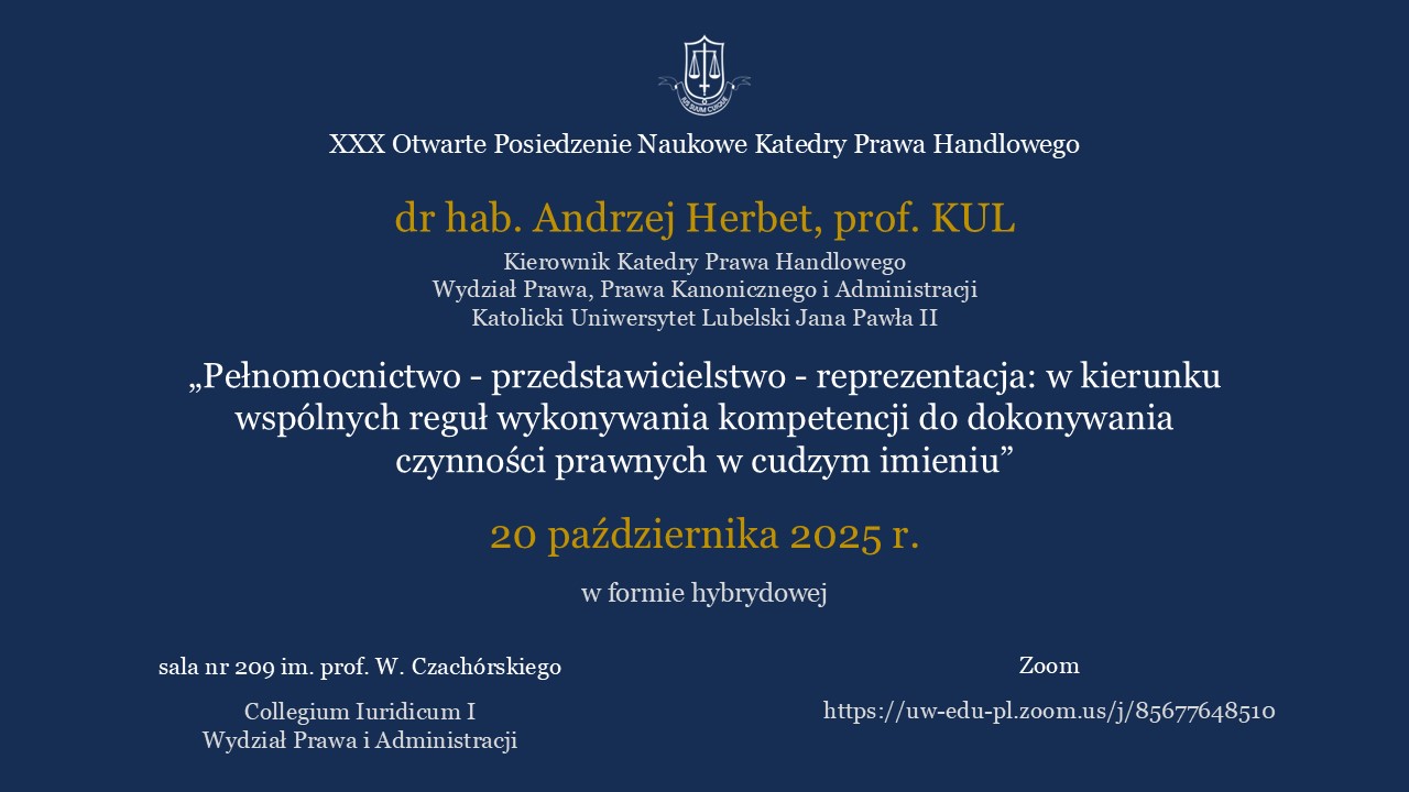 Kierownik Centrum Prawa Firm Rodzinnych UW, Pan Profesor Konrad Osajda, zaprasza na XXX Otwarte Posiedzenie Naukowe również przez niego kierowanej Katedry Prawa Handlowego Uniwersytetu Warszawskiego. Na najbliższym spotkaniu pan dr hab. Andrzej Herbet, prof. KUL (Kierownik Katedry Prawa Handlowego na Wydziale Prawa, Prawa Kanonicznego i Administracji Katolickiego Uniwersytetu Lubelskiego Jana Pawła II) wystąpi z referatem pt. „Pełnomocnictwo – przedstawicielstwo – reprezentacja: w kierunku wspólnych reguł wykonywania kompetencji do dokonywania czynności prawnych w cudzym imieniu”. Zarówno wystąpienie, jak i planowana po nim dyskusja odbędą się w języku polskim. W seminarium można wziąć udział w poniedziałek 20 października 2025 r. o godzinie 17:00, w formie hybrydowej: